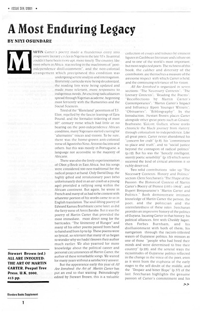 Review of: Stewart Brown (ed.). All are involved: the art of Martin Carter. Leeds: Peepal Tree, 2000