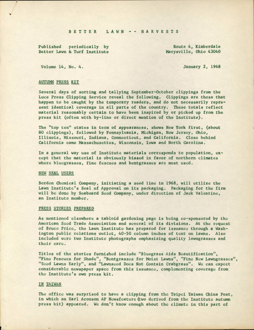 Better lawn harvests. Vol. 14 no. 4 (1968 January 2)
