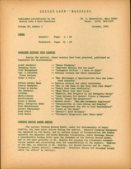 Better lawn harvests. Vol. 20 no. 3 (1973 October)