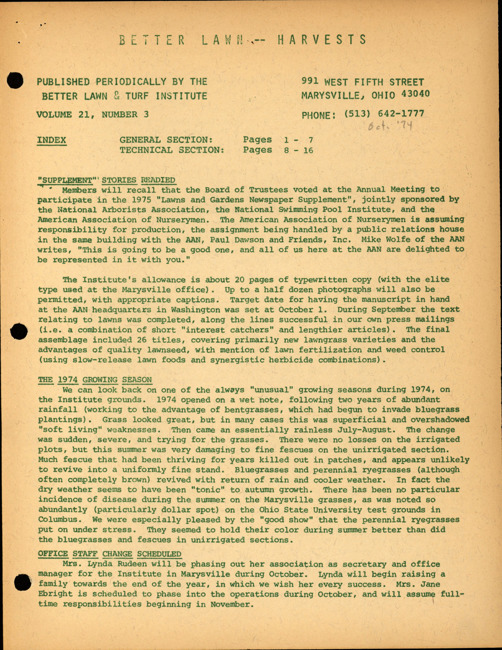 Better lawn harvests. Vol. 21 no. 3 (1974 October)
