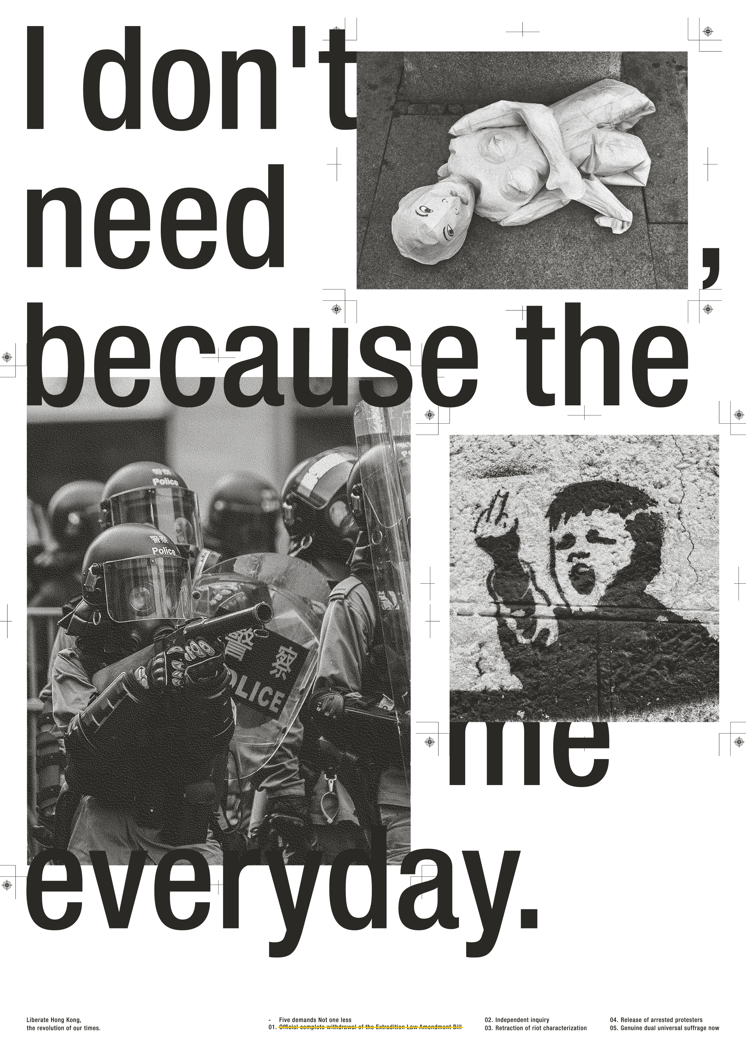 Poster shows its message using a combination of words and photos, with five demands of the movement listed at the bottm and have the first demand struck.