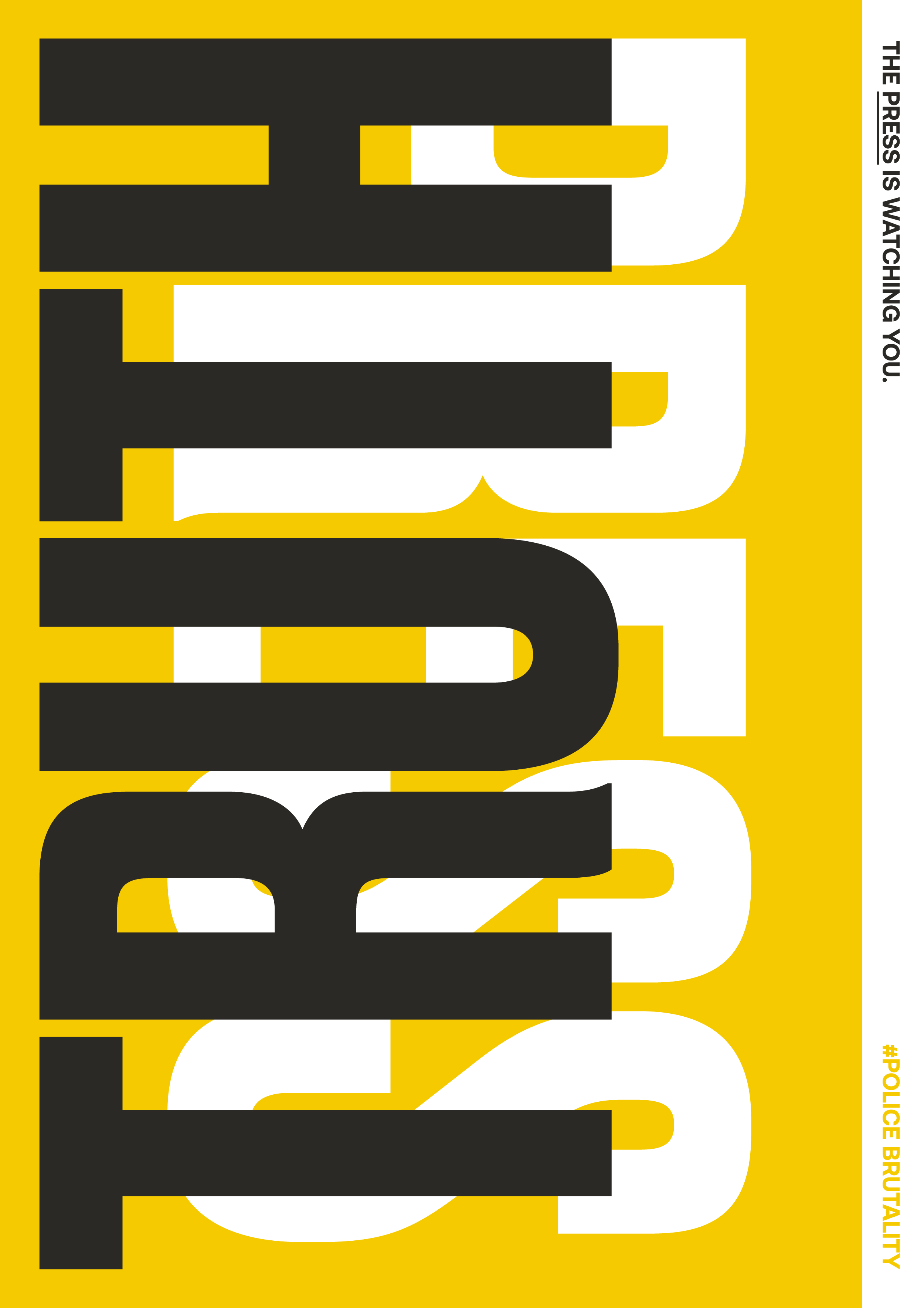 The poster shows the words "Press" and "Truth" in capital letters on a yellow background with the former in white and the latter in black.