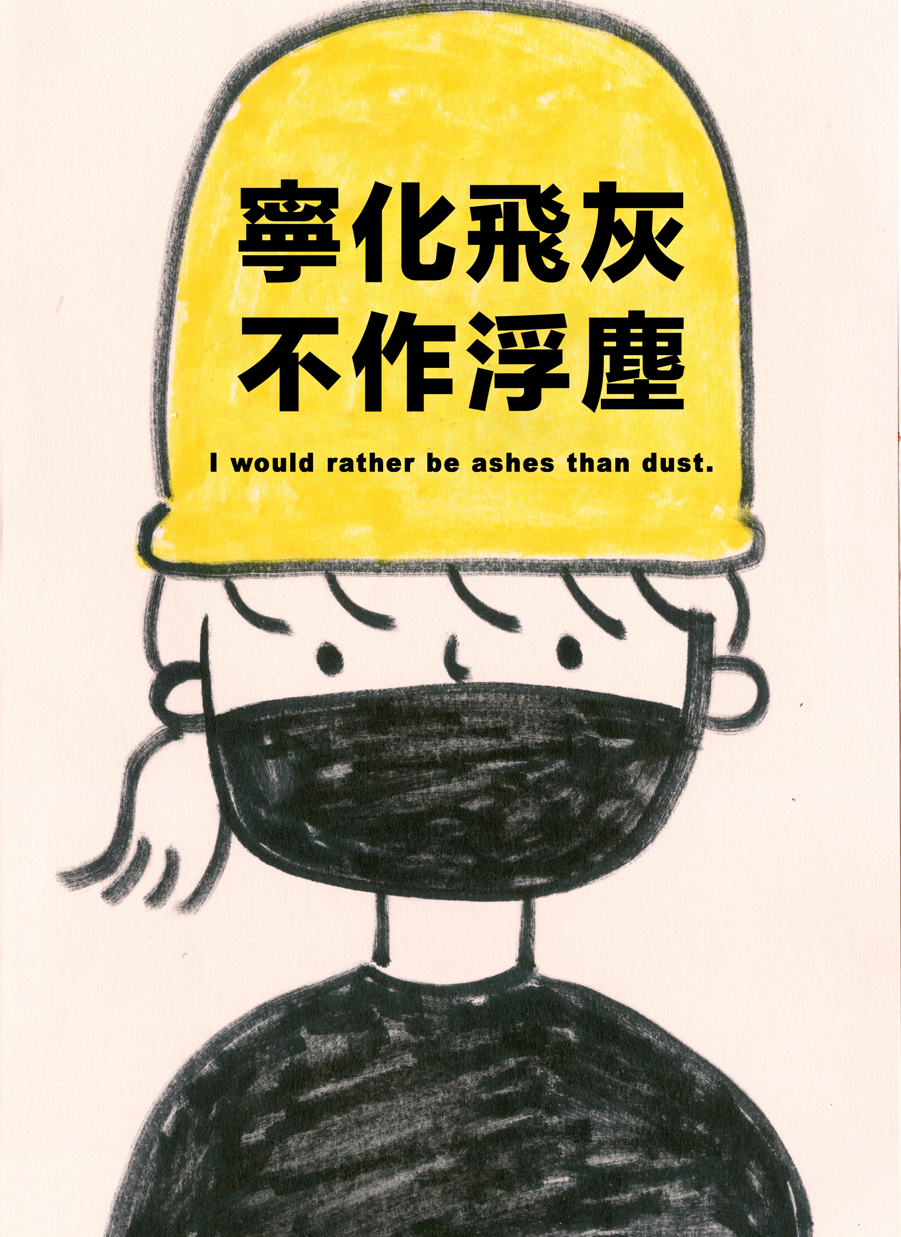 Sticker shows an image of a protester wearing a black t-shirt, a black face mask, and a yellow hard hat with text printed on it.