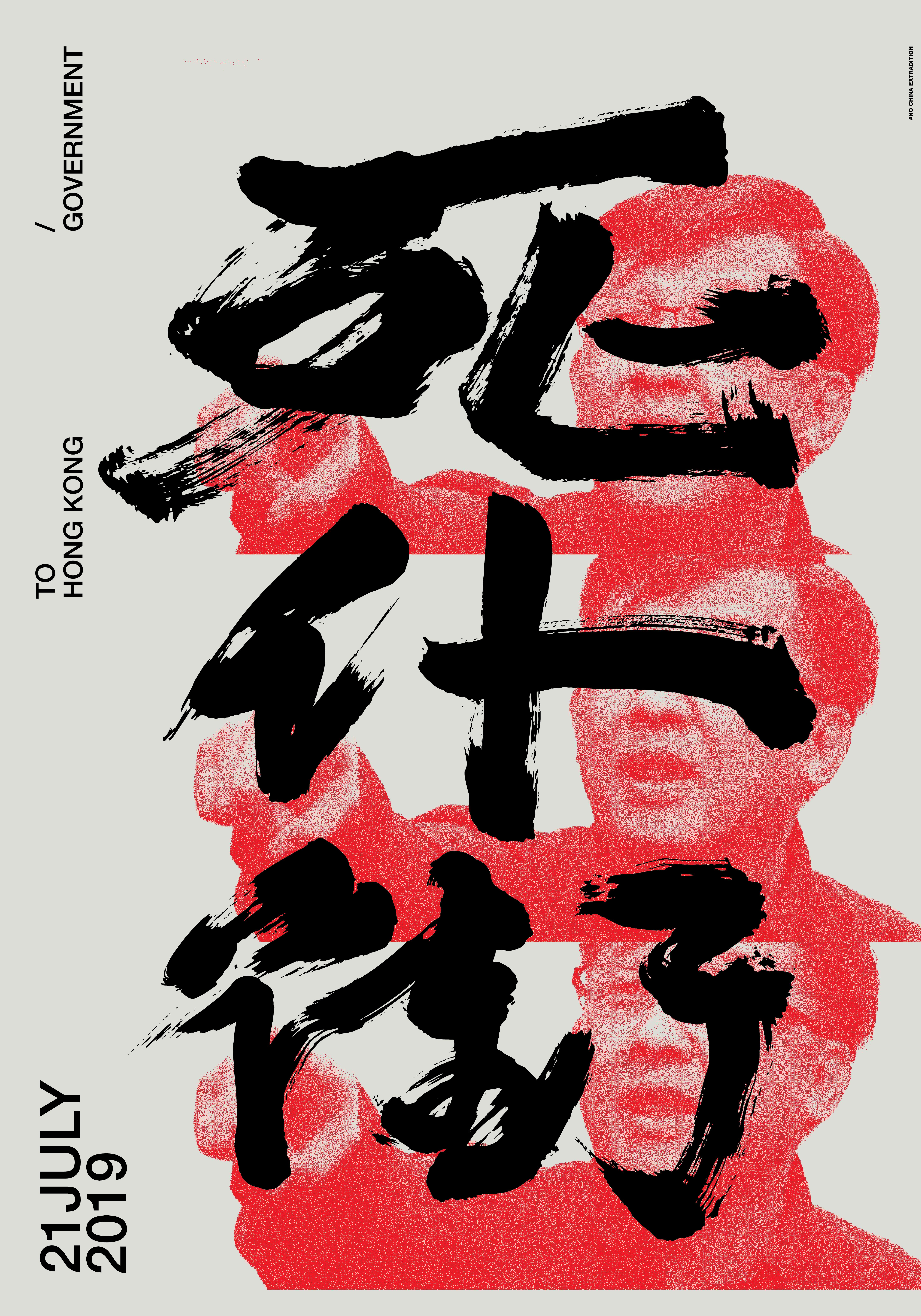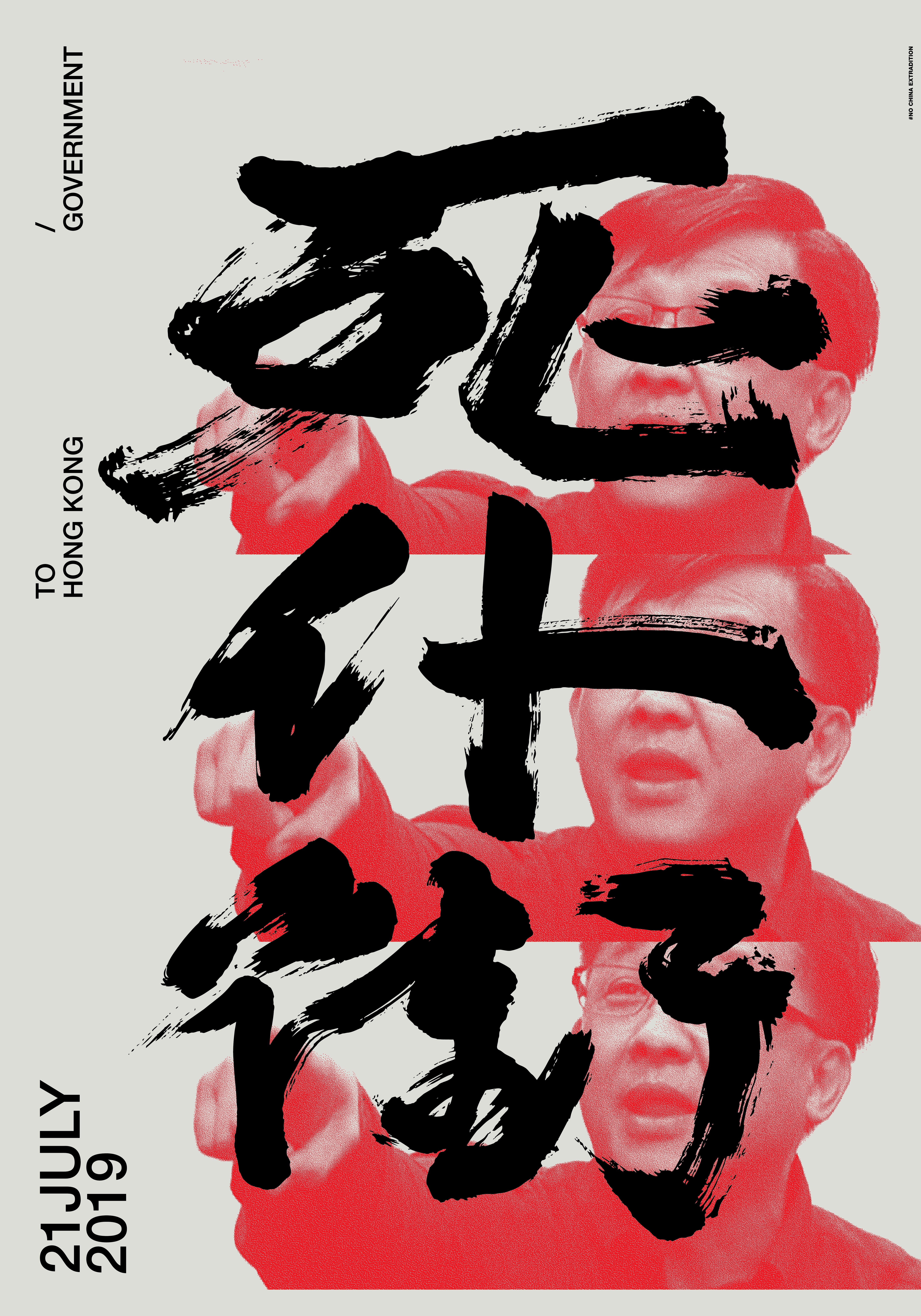 Poster shows three images of Junius Ho in red behind title. On the left is the date and "To Hong Kong government." In the upper right corner is the text "#NO CHINA EXTRADITION."