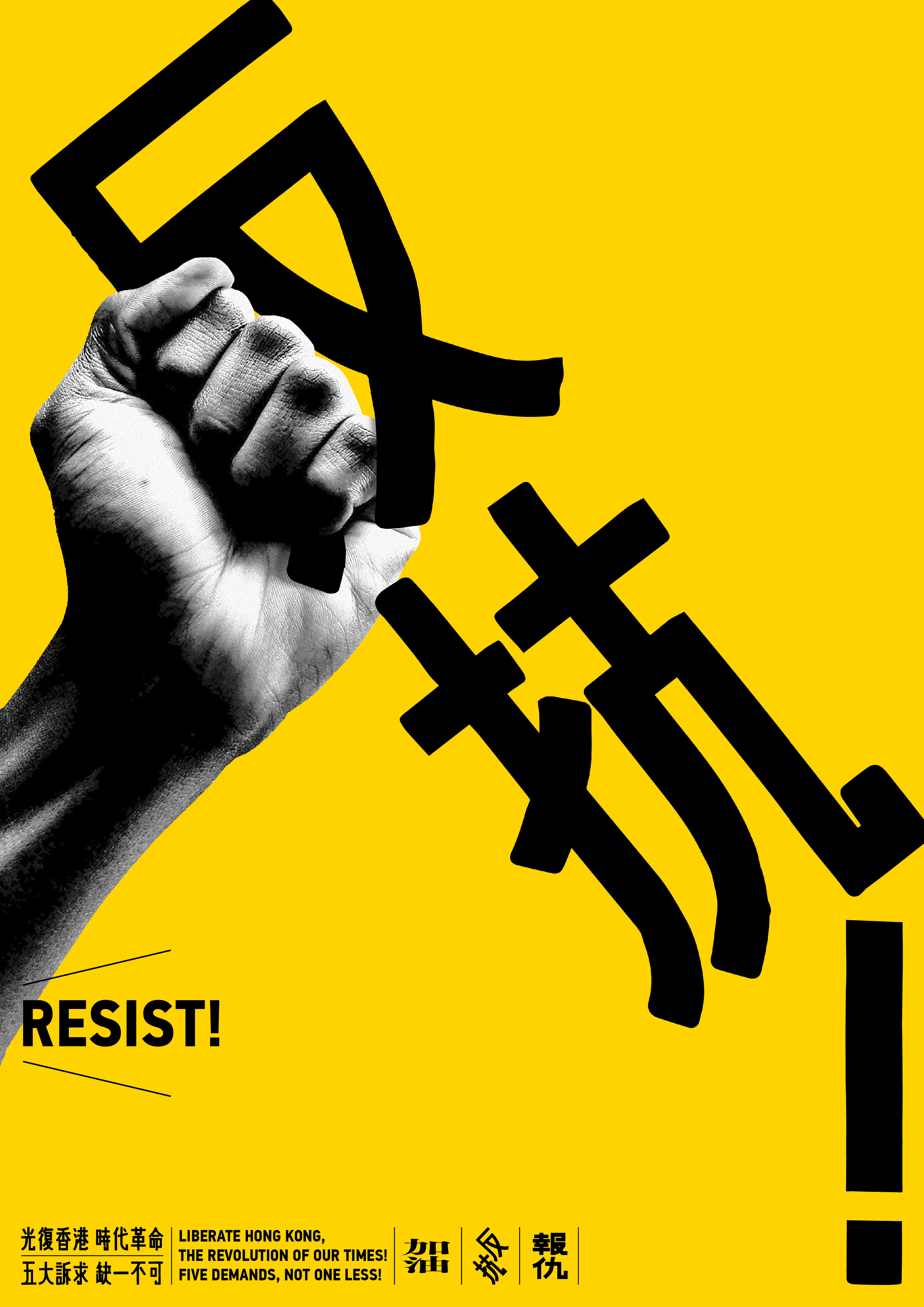 Poster shows a left hand holding the phrase "反抗!" with Chinese and English slogans of the protest movement printed at the bottom.