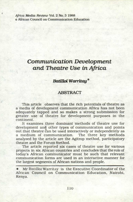 This article observes that the rich potentials of theatre as a media of development communication Africa has not been adequately tapped and so makes a strong submission for greater use of theatre for development purposes in the continent. It examines three dominant methods of theatre use for development and other types of communication and points out that theatre can be used interactively or independently as a medium of communication. The three key methods analyzed by the article are the Agitrop method, participatory theatre and the Forum method. The article reported six cases of theatre use for various projects in six African countries and concludes that the role of today's African communicator must be such that relevant communication forms are used in an interactive manner for the largest segments of African nations and people.