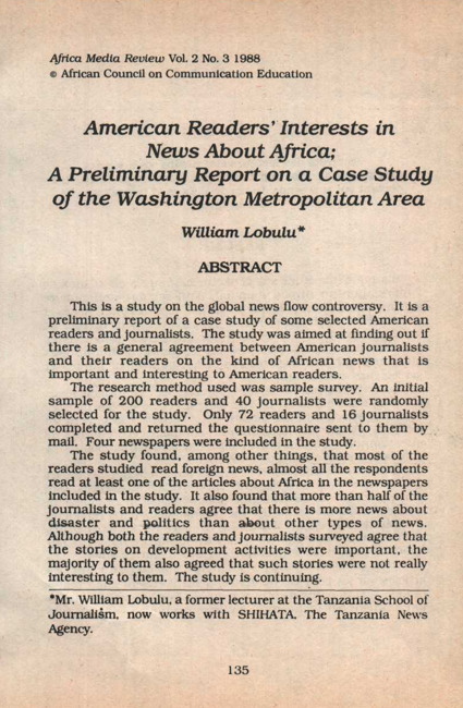 American readers' Interests in news about Africa : a preliminary report on a case study of the Washington Metropolitan Area