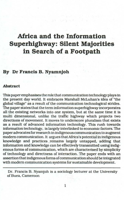 This paper emphasises the role that communication technology plays in the present day world. It embraces Marshall McLuhan's idea of "the global village" as a result of the communication technological strides. The paper states that the term information superhighway incorporates all the existing networks into one system, but at the same time it is multi dimensional, unlike the traffic highway which projects two directions of movement. It moves to underscore pluralism that exists as a result of advanced information technology. This rush towards information technology, is largely interlinked to economic factors. The paper advocates for research in indigenous communication to augment modern communication. It argues that Africa's potential in indigenous knowledge and practices remains largely untapped, adding that information and knowledge can be effectively transmitted using indigenous forms of communication, which are characterised by simplicity of technology and directness of interaction. The paper ends with an assertion that indigenous forms of communication should be integrated with modern communication systems for sustainable development.