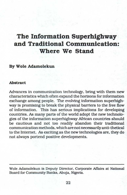 Advances in communication technology, bring with them new characteristics which often expand the horizons for information exchange among people. The evolving information superhighway is promising to break the physical barriers to the free flow of information. This has serious implications for developing countries. As many parts of the world adopt the new technologies of the information superhighway African countries should be cautious and not too readily abandon their traditional communication methods, which are not necessarily anti-thetical to the Internet. As exciting as the new technologies are, they do not always portend positive developments.