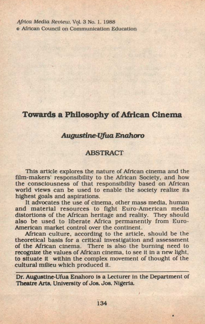 This article explores the nature of African cinema and the film-makers' responsibility to the African society, and how the consciousness of that responsibility based on African world views can be used to enable the society realize its highest goals and aspirations. It advocates the use of cinema, other mass media, human and material resources to fight Euro-American media distortions of the African heritage and reality. They should also be used to liberate Africa permanently from Euro- American market control over the continent. African culture, according to the article, should be the theoretical basis for a critical investigation and assessment of the African cinema. There is also the burning need to recognize the values of African cinema, to see it in a new light, to situate it within the complex movement of thought of the cultural milieu which produced It.