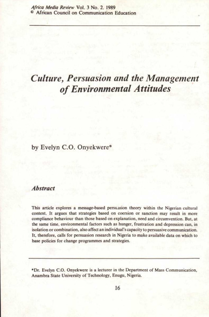 This article explores a message-based persuasion theory within the Nigerian cultural context. It argues that strategies based on coersion or sanction may result in more compliance behaviour than those based on explanation, need and circumvention. But, at the same time, environmental factors such as hunger, frustration and depression can, in isolation or combination, also affect an individual's capacity to persuasive communication. It, therefore, calls for persuasion research in Nigeria to make available data on which to base policies for change programmes and strategies.