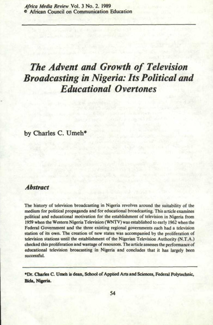 The history of television broadcasting in Nigeria revolves around the suitability of the medium for political propaganda and for educational broadcasting. This article examines political and educational motivation for the establishment of television in Nigeria from 1959 when the Western Nigeria Television (WNTV) was established to early 1962 when the Federal Government and the three existing regional governments each had a television station of its own. The creation of new states was accompanied by the proliferation of television stations until the establishment of the Nigerian Television Authority (N.T.A.) checked this proliferation and wastage of resources. The article assesses the performance of educational television broacasting in Nigeria and concludes that it has largely been successful.