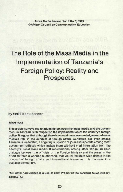 This article surveys the relationship between the mass media and the government in Tanzania with respect to the implementation of the country's foreign policy. It argues that although there is a unanimous acknowledgement of mass media's role in the conduct of foreign affairs worldwide and even among Tanzania's leadership, a lingering suspicion of journalists persits among most government officials which makes them withhold vital information from the country's local mass media. It recommends, among other things, an open dialogue between the officials of the Foreign Ministry and the press in the effort to forge a working relationship that would facilitate wide debate in the conduct of foreign affairs and international issues as it is the case in a socialist democracy.
