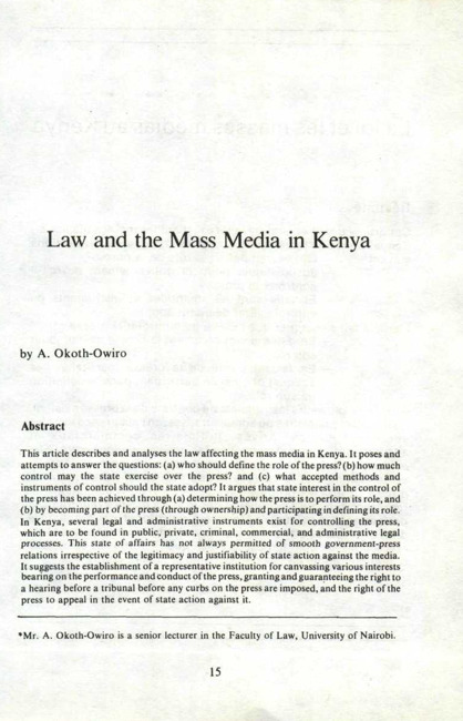 This article describes and analyses the law affecting the mass media in Kenya. It poses and attempts to answer the questions: (a) who should define the role of the press? (b) how much control may the state exercise over the press? and (c) what accepted methods and instruments of control should the state adopt? It argues that state interest in the control of the press has been achieved through (a) determining how the press is to perform its role, and (b) by becoming part of the press (through ownership) and participating in defining its role. In Kenya, several legal and administrative instruments exist for controlling the press, which are to be found in public, private, criminal, commercial, and administrative legal processes. This state of affairs has not always permitted of smooth government-press relations irrespective of the legitimacy and justifiability of state action against the media. It suggests the establishment of a representative institution for canvassing various interests bearing on the performance and conduct of the press, granting and guaranteeing the right to a hearing before a tribunal before any curbs on the press are imposed, and the right of the press to appeal in the event of state action against it.