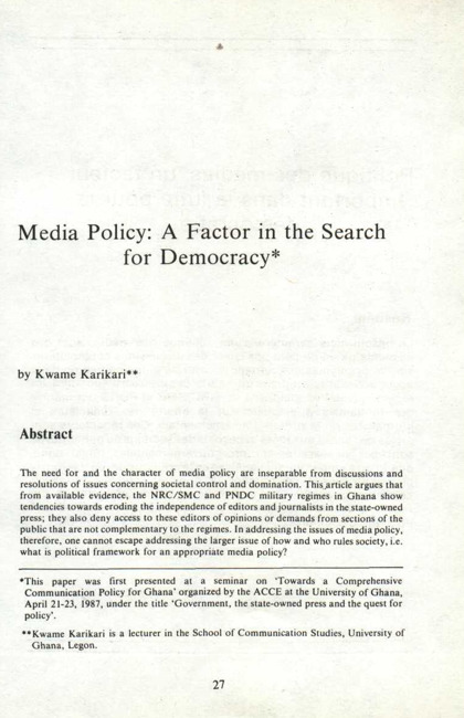 The need for and the character of media policy are inseparable from discussions and resolutions of issues concerning societal control and domination. This article argues that from available evidence, the NRC/SMC and PNDC military regimes in Ghana show tendencies towards eroding the independence of editors and journalists in the state-owned press; they also deny access to these editors of opinions or demands from sections of the public that are not complementary to the regimes. In addressing the issues of media policy, therefore, one cannot escape addressing the larger issue of how and who rules society, i.e. what is political framework for an appropriate media policy?