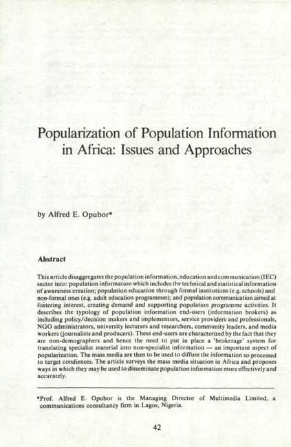 This article disaggregates the population information, education and communication (IEC) sector into: population information which includes the technical and statistical information of awareness creation; population education through formal institutions (e.g. schools) and non-formal ones (e.g. adult education programmes); and population communication aimed at fostering interest, creating demand and supporting population programme activities. It describes the typology of population information end-users (information brokers) as including policy/decision makers and implementors, service providers and professionals, NGO administrators, university lecturers and researchers, community leaders, and media workers (journalists and producers). These end-users are characterized by the fact that they are non-demographers and hence the need to put in place a 'brokerage' system for translating specialist material into non-specialist information an important aspect of popularization. The mass media are then to be used to diffuse the information so processed to target condiences. The article surveys the mass media situation in Africa and proposes ways in which they may be used to disseminate population information more effectively and accurately.