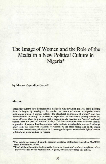 This article surveys how the mass media in Nigeria portray women and treat issues affecting them. It begins by looking at the number and status of women in Nigerian media institutions which, it argues, reflects 'the structural oppression of women' and their 'subordination in society'. It proceeds to argue that the mass media portray women and issues affecting them in a manner that is predominately negative and 'special' as though women were not part of 'normal' society. This has constituted overt or covert mental oppression of women. It calls on women in the media to spearhead the struggle for change away from the stereotype treatment of women by the mass media, and on the media themselves to consciously eliminate such stereotype images of women in the light of the new political and social culture in Nigeria.