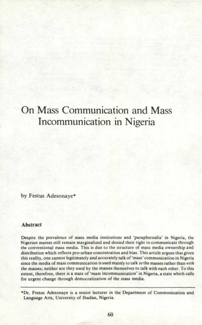 Despite the prevalence of mass media institutions and 'paraphernalia' in Nigeria, the Nigerian masses still remain marginalized and denied their right to communicate through the conventional mass media. This is due to the structure of mass media ownership and distribution which reflects pro-urban concentration and bias. This article argues that given this reality, one cannot legitimately and accurately talk of 'mass' communication in Nigeria since the media of mass communication is used mainly to talk to the masses rather than with the masses; neither are they used by the masses themselves to talk with each other. To this extent, therefore, there is a state of 'mass incommunication' in Nigeria, a state which calls for urgent change through democratization of the mass media.