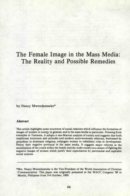 This article highlights some structures of social relations which influence the formation of images of women in society in general, and in the mass media in particular. Drawing from examples in Tanzania, it adopts a neo-Marxist analysis of society and suggests that both traditional structures and attitudes and modern socio-economic relations, buttressed by prejudices in dominant religions, subjugate women to subsidiary roles in development. Hence their negative portrayal in the mass media. It suggests major reforms in the socialization of the youth within the family and the wider society as a means of fighting the negative images of women which justify their exploitation by partriachal and capitalist social systems.