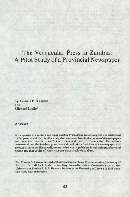 The vernacular press in Zambia : a pilot study of a provincial newspaper