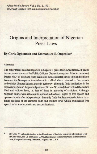 The paper traces colonial legacies in Nigeria's press laws. Specifically, it traces the early antecedents of the Public Officers (Protection Against False Accusation) Decree No. 4 of 1984 and finds that it was modelled after earlier libel and sedition laws and the Newspaper Amendment Act, all of which criminalize free speech and opinion directed against those in authority. The study finds similarities in the motivations behind the promulgation of Decree No. 4 and those behind the earlier libel and sedition laws, i.e. fear of those in authority of criticism. Although Nigerian courts were reluctant to uphold individuals' rights of free speech and opinion shortly after independence, the study finds that later court decisions have found sections of the criminal code and sedition laws which criminalize free speech to be anachronistic and unconstitutional.