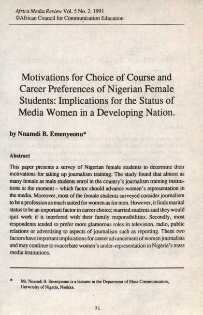 Motivations for choice of course and career preferences of Nigerian female students : implications for the status of media women in a developing nation
