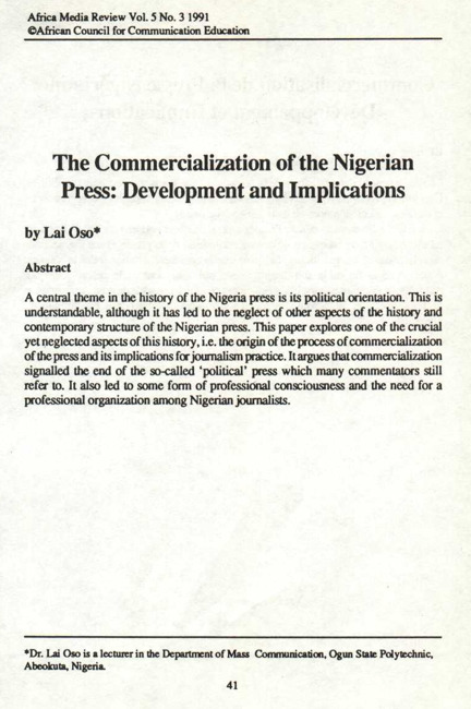 A central theme in the history of the Nigeria press is its political orientation. This is understandable, although it has led to the neglect of other aspects of the history and contemporary structure of the Nigerian press. This paper explores one of the crucial yet neglected aspects of this history, i.e. the origin of the process of commercialization of the press and its implications for journalism practice. It argues that commercialization signalled the end of the so-called 'political' press which many commentators still refer to. It also led to some form of professional consciousness and the need for a professional organization among Nigerian journalists.