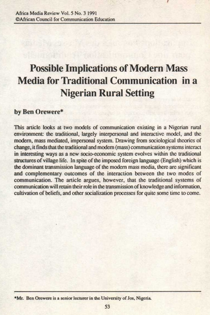 Possible implications of modern mass media for traditional communication in a Nigerian rural setting