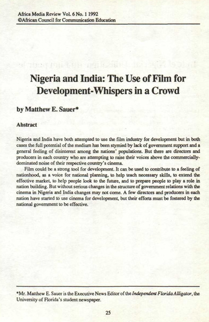 Nigeria and India have both attempted to use the film industry for development but in both cases the full potential of the medium has been stymied by lack of government support and a general feeling of disinterest among the nations' populations. But there are directors and producers in each country who are attempting to raise their voices above the commercially dominated noise of their respective country's cinema. Film could be a strong tool for development. It can be used to contribute to a feeling of nationhood, as a voice for national planning, to help teach necessary skills, to extend the effective market, to help people look to the future, and to prepare people to play a role in nation building. But without serious changes in the structure of government relations with the cinema in Nigeria and India changes may not come. A few directors and producers in each nation have started to use cinema for development, but their efforts must be fostered by the national government to be effective.