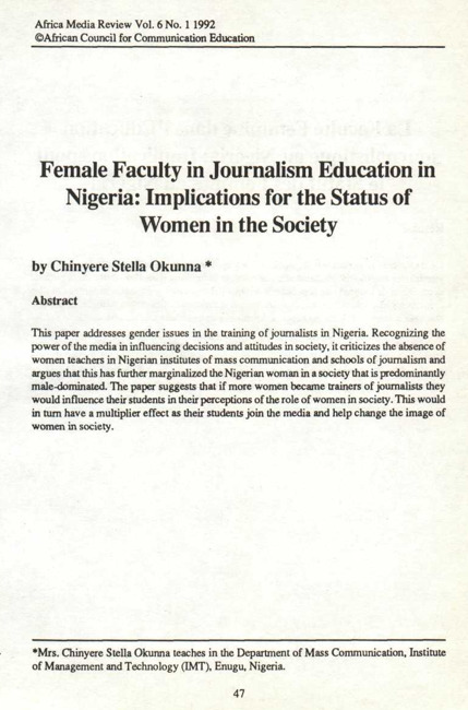 Female faculty in journalism education in Nigeria : implications for the status of women in the society
