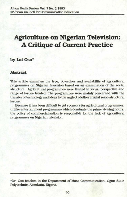 This article examines the type, objectives and availability of agricultural programmes on Nigerian television based on an examination of the social structure. Agricultural programmes were limited in focus, perspective and range of issues treated. The programmes were mainly concerned with the transfer of technology and ideas to the neglect of other crucial socio-structural issues. Because it has been difficult to get sponsors for agricultural programmes, unlike entertainment programmes which dominate the prime viewing hours, the policy of commercialisation is responsible for the lack of agricultural programmes on Nigerian television.