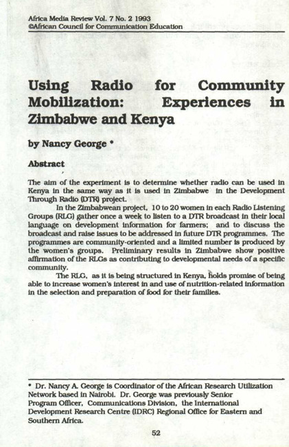 The aim of the experiment is to determine whether radio can be used In Kenya in the same way as it is used in Zimbabwe in the Development Through Radio (DTR) project. In the Zimbabwean project, 10 to 20 women in each radio listening groups (RLG) gather once a week to listen to a DTR broadcast In their local language on development information for farmers; and to discuss the broadcast and raise issues to be addressed In future DTR programmes. The programmes are community-oriented and a limited number is produced by the women's groups. Preliminary results in Zimbabwe show positive affirmation of the RLGs as contributing to developmental needs of a specific community. The RLG, as it is being structured in Kenya, holds promise of being able to increase women's interest in and use of nutrition-related information in the selection and preparation of food for their families.