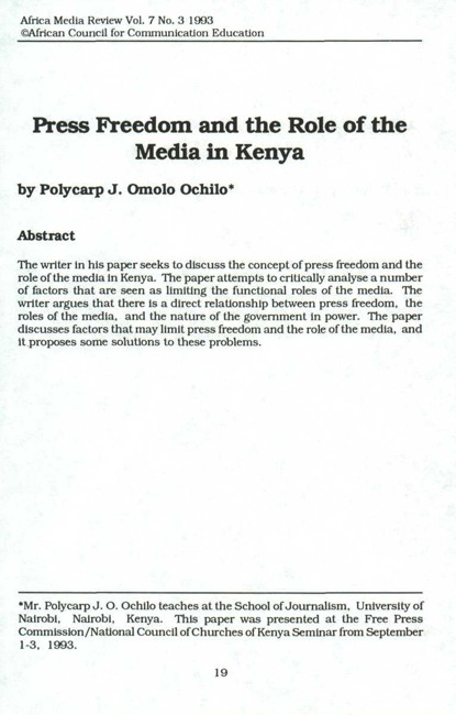 The writer In his paper seeks to discuss the concept of press freedom and the role of the media in Kenya. The paper attempts to critically analyse a number of factors that are seen as limiting the functional roles of the media. The writer argues that there Is a direct relationship between press freedom, the roles of the media, and the nature of the government in power. The paper discusses factors that may limit press freedom and the role of the media, and it proposes some solutions to these problems.