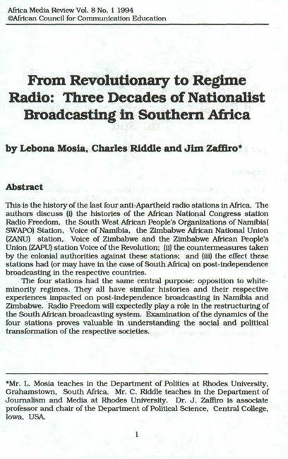 This is the history of the last four anti-Apartheid radio stations in Africa. The authors discuss (i) the histories of the African National Congress station Radio Freedom, the South West African People's Organizations of Namibia (SWAPO) Station, Voice of Namibia, the Zimbabwe African National Union (ZANU) station, Voice of Zimbabwe and the Zimbabwe African People's Union (ZAPU) station Voice of the Revolution; (ii) the countermeasures taken by the colonial authorities against these stations; and (iii) the effect these stations had (or may have in the case of South Africa) on post-independence broadcasting in the respective countries. The four stations had the same central purpose: opposition to whiteminority regimes. They all have similar histories and their respective experiences impacted on post-independence broadcasting in Namibia and Zimbabwe. Radio Freedom will expectedly play a role in the restructuring of the South African broadcasting system. Examination of the dynamics of the four stations proves valuable in understanding the social and political transformation of the respective societies.