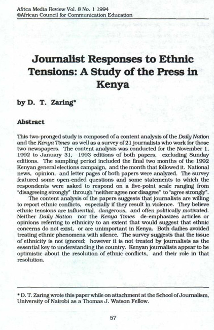 This two-pronged study is composed of a content analysis of the Daily Nation and the Kenya Times as well as a survey of 21 journalists who work for those two newspapers. The content analysis was conducted for the November 1, 1992 to January 31, 1993 editions of both papers, excluding Sunday editions. The sampling period included the final two months of the 1992 Kenyan general elections campaign, and the month that followed it. National news, opinion, and letter pages of both papers were analyzed. The survey featured some open-ended questions and some statements to which the respondents were asked to respond on a five-point scale ranging from "disagreeing strongly" through "neither agree nor disagree" to "agree strongly". The content analysis of the papers suggests that journalists are willing to report ethnic conflicts, especially if they result in violence. They believe ethnic tensions are influential, dangerous, and often politically motivated. Neither Daily Nation nor the Kenya Times de-emphasizes articles or opinions referring to ethnicity to an extent that would suggest that ethnic concerns do not exist, or are unimportant in Kenya. Both dailies avoided treating ethnic phenomena with silence. The survey suggests that the issue of ethnicity is not ignored; however it is not treated by journalists as the essential key to understanding the country. Kenyan journalists appear to be optimistic about the resolution of ethnic conflicts, and their role in that resolution.