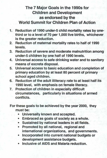 The 7 major goals in the 1990s for children and development as endorsed by the World Summit for Children Plan of Action