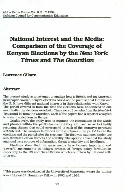 The present study is an attempt to analyze how a British and an American newspaper covered Kenya's elections based on the premise that Britain and the U. S. have different national interests in their relationship with Kenya. The period covered is from the date the elections were announced to one month after the elections were held. There were 11 articles from the New York Times and 12 from the Guardian. Each of the papers had a reporter assigned to cover the elections in Kenya. Qualitatively, the study tries to examine the connotation of the words and phrases within the particular context they are used so as to identify recurring themes that could correspond to each of the country's perceived self-interest. The analysis is divided into two phases - the period before the elections and the period after the elections. The first was examined under two sub-themes: election fairness and stability. The specific areas that the study analyzed were sources of information, threat to stability and headlines. Findings show that the mass media have become important and powerful instruments in today's process of foreign policy formulation especially in the US and Great Britain which are driven by national self interest.