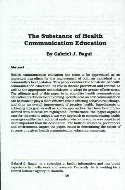 Health communication education has come to be appreciated as an important ingredient for the improvement of both an individual or a community's health status. This paper examines the substence of health communication education, its role in disease prevention and control, as well as the appropriate methodologies to adopt for greater effectiveness. The ultimate goal of this paper is to stimulate health communication education practitioners into coming up with ideas on how communication can be made to play a more effective role in effecting behaviourial change, and thus an overall improvement of people's health. Impediments to achieving this goal as well as known approaches that have been implemented with success are highlighted. Furthermore, the paper argues a case for the need to adopt a two-way approach in communicating health messages unlike the traditional system where the source was considered more important than the destination. The individual's needs, preferences and environment, argues the paper, count in determining the extent of success in a given health communication education campaign.