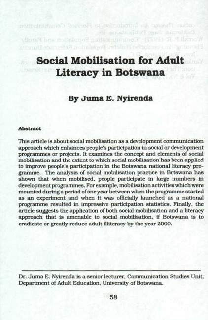 This article is about social mobilisation as a development communication approach which enhances people's participation in social or development programmes or projects. It examines the concept and elements of social mobilisation and the extent to which social mobilisation has been applied to improve people's participation in the Botswana national literacy programme. The analysis of social mobilisation practice in Botswana has shown that when mobilised, people participate in large numbers in development programmes. For example, mobilisation activities which were mounted during a period of one year between when the programme started as an experiment and when it was officially launched as a national programme resulted in impressive participation statistics. Finally, the article suggests the application of both social mobilisation and a literacy approach that is amenable to social mobilisation, if Botswana is to eradicate or greatly reduce adult illiteracy by the year 2000.