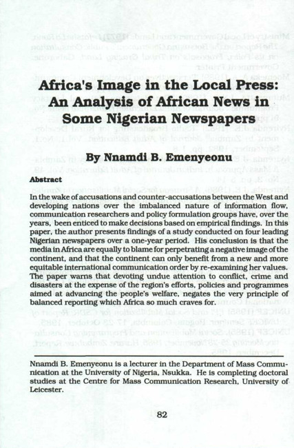In the wake of accusations and counter-accusations between the West and developing nations over the unbalanced nature of information flow, communication researchers and policy formulation groups have, over the years, been enticed to make decisions based on empirical findings. In this paper, the author presents findings of a study conducted on four leading Nigerian newspapers over a one-year period. His conclusion is that the media in Africa are equally to blame for perpetrating a negative image of the continent, and that the continent can only benefit from a new and more equitable international communication order by re-examining her values. The paper warns that devoting undue attention to conflict, crime and disasters at the expense of the region's efforts, policies and programmes aimed at advancing the people's welfare, negates the very principle of balanced reporting which Africa so much craves for.