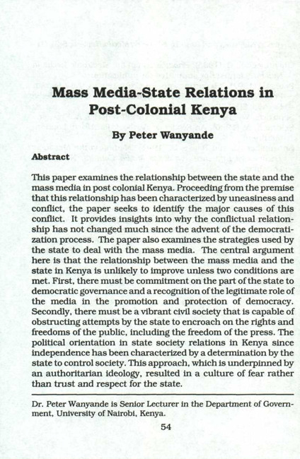 This paper examines the relationship between the state and the mass media in post colonial Kenya. Proceeding from the premise that this relationship has been characterized by uneasiness and conflict, the paper seeks to identify the major causes of this conflict. It provides insights into why the conflictual relationship has not changed much since the advent of the democratization process. The paper also examines the strategies used by the state to deal with the mass media. The central argument here is that the relationship between the mass media and the state in Kenya is unlikely to improve unless two conditions are met. First, there must be commitment on the part of the state to democratic governance and a recognition of the legitimate role of the media in the promotion and protection of democracy. Secondly, there must be a vibrant civil society that is capable of obstructing attempts by the state to encroach on the rights and freedoms of the public, including the freedom of the press. The political orientation in state society relations in Kenya since independence has been characterized by a determination by the state to control society. This approach, which is underpinned by an authoritarian ideology, resulted in a culture of fear rather than trust and respect for the state.
