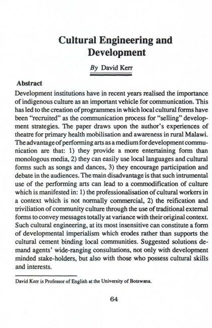 Development institutions have in recent years realised the importance of indigenous culture as an important vehicle for communication. This has led to the creation of programmes in which local cultural forms have been "recruited" as the communication process for "selling" development strategies. The paper draws upon the author's experiences of theatre for primary health mobilisation and awareness in rural Malawi. The advantage of performing arts as a medium for development communication are that: 1) they provide a more entertaining form than monologous media, 2) they can easily use local languages and cultural forms such as songs and dances, 3) they encourage participation and debate in the audiences. The main disadvantage is that such intrumental use of the performing arts can lead to a cornmodification of culture which is manifested in: 1) the professionalisation of cultural workers in a context which is not normally commercial, 2) the reification and triviliation of community culture through the use of traditional external forms to convey messages totally at variance with their original context. Such cultural engineering, at its most insensitive can constitute a form of developmental imperialism which erodes rather than supports the cultural cement binding local communities. Suggested solutions demand agents' wide-ranging consultations, not only with development minded stake-holders, but also with those who possess cultural skills and interests.