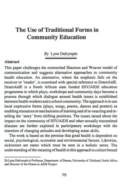 This paper challenges the entrenched Shannon and Weaver model of communication and suggests alternative approaches to community health education. An alternative, where the emphasis falls on the receiver or 'reader', is examined with special reference to DramAidE. DramAidE is a South African state funded HIV/AIDS education programme in which plays, workshops and community days become a process through which dialogue around health issues is established between health workers and a school community. The approach is to use local expressive forms (plays, songs, poems, dances and posters) as enabling resources or mechanisms of learning and of re-enacting and retelling the 'story' from shifting positions. The issues raised about the impact on the community of HIV/AIDS and other sexually transmitted diseases are further explored in participatory workshops with the intention of changing attitudes and developing some skills. The work is based on the premise that good health is dependent on social, psychological, economic and environmental factors. Likewise, sicknesses are states which must be seen in a holistic sense. The understanding of the meaning of health in this approach is culture bound and it is important not to separate out the physiological from the cultural. A further contention is that health, as a constituent and dynamic component of subjectivity does not refer to a state so much as to a process. This means that health is about self-image, self-esteem and self-confidence. The drama based workshops offered in the progamme focus on building self-esteem and self-awareness as a first step in making choices about healthy behaviour. Therefore, health education should not be actively aimed at changing personal behaviour alone. Young people need to demonstrate skills in changing their social environment and to this end DramAidE is forming clubs in schools that will become self-sufficient and to encourage the school community to take pride in building a culture of learning and health promotion in the school. The long term aim of DramAidE is to develop a social movement around celebrating the joy of choosing to live a healthy life style. We are asking ourselves and young people to 'Act Alive'. One strategy for mobilising young people is build an awareness of the interaction between human rights and health and thus find a common theme that cuts across differences of heritage and culture