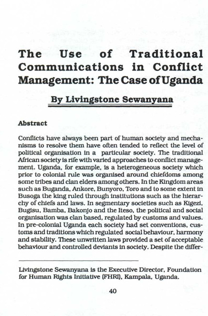 Conflicts have always been part of human society and mechanisms to resolve them have often tended to reflect the level of political organisation in a particular society. The traditional African society is rife with varied approaches to conflict management. Uganda, for example, is a heterogeneous society which prior to colonial rule was organised around chiefdoms among some tribes and clan elders among others. In the Kingdom areas such as Buganda, Ankore, Bunyoro, Toro and to some extent in Busoga the king ruled through institutions such as the hierarchy of chiefs and laws. In segmentary societies such as Kigezi, Bugisu, Bamba, Bakonjo and the Iteso, the political and social organisation was clan based, regulated by customs and values. In pre-colonial Uganda each society had set conventions, customs and traditions which regulated social behaviour, harmony and stability. These unwritten laws provided a set of acceptable behaviour and controlled deviants in society. Despite the differences in political organisation, it is generally agreed that each of these societies had elaborate systems of governance, rule of law, justice and administrative organs. Each member of society was supposed to know his rights and sanctions were imposed on those individuals who did not comply with the norms. This article will address the issue of conflict, how it was dealt with in traditional African culture, the methods of communication both in traditional and modern Uganda and the question of rights and responsibilities in promoting cross-cultural amity.