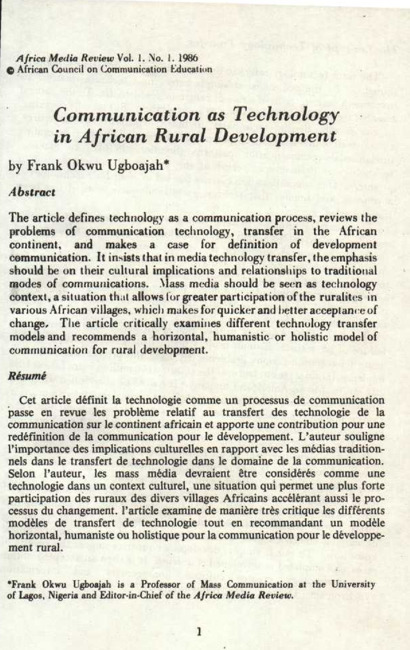 The article defines technology as a communication process, reviews the problems of communication technology, transfer in the African continent, and makes a case for definition of development communication. It insists that in media technology transfer, the emphasis should be on their cultural implications and relationships to traditional modes of communications. Mass media should be seen as technology context, a situation that allows for greater participation of the ruralites in various African villages, which makes for quicker and better acceptance of change. The article critically examines different technology transfer models and recommends a horizontal, humanistic or holistic model of communication for rural development.