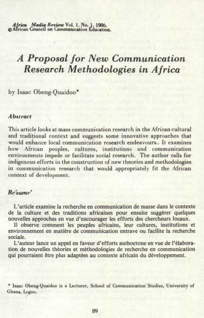 This article looks at mass communication research in the African cultural and traditional context and suggests some innovative approaches that would enhance local communication research endeavours. It examines how African peoples, cultures, institutions and communication environments impede or facilitate social research. The author calls for indigenous efforts in the construction of new theories and methodologies in communication research that would appropriately fit the African context of development.