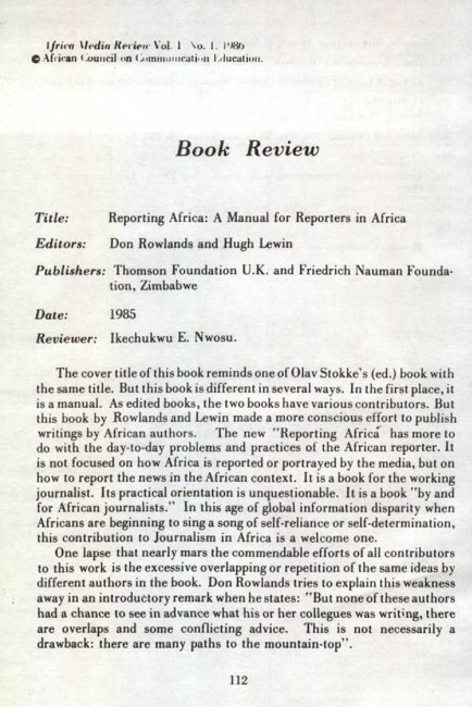 Book review : Reporting Africa: a manual for reporters in Africa. Don Rowlands and Hugh Lewin (eds.). Zimbabwe, Thomson Foundation U.K. and Friedrich Nauman Foundation, 1985