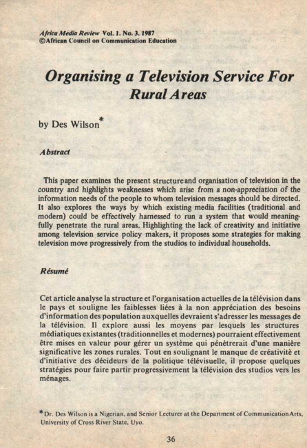 This paper examines the present structure and organisation of television in the country and highlights weaknesses which arise from a non-appreciation of the information needs of the people to whom television messages should be directed. It also explores the ways by which existing media facilities (traditional and modern) could be effectively harnessed to run a system that would meaningfully penetrate the rural areas. Highlighting the lack of creativity and initiative among television service policy makers, it proposes some strategies for making television move progressively from the studios to individual households.