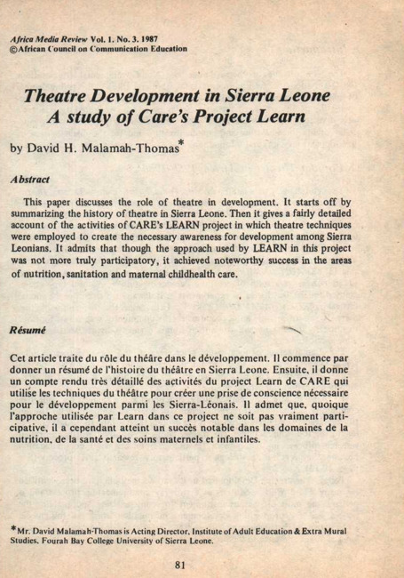 This paper discusses the role of theatre in development. It starts off by summarizing the history of theatre in Sierra Leone. Then it gives a fairly detailed account of the activities of CARE's LEARN project in which theatre techniques were employed to create the necessary awareness for development among Sierra Leonians. It admits that though the approach used by LEARN in this project was not more truly participatory, it achieved noteworthy success in the areas of nutrition, sanitation and maternal childhealth care.