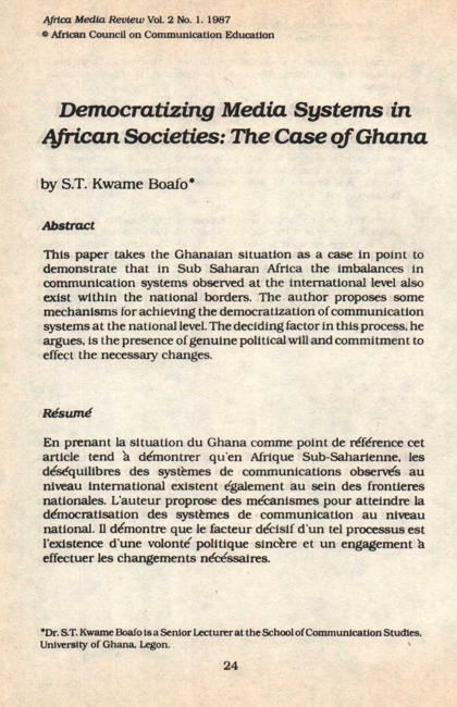 This paper takes the Ghanaian situation as a case in point to demonstrate that in Sub Saharan Africa the imbalances in communication systems observed at the international level also exist within the national borders. The author proposes some mechanisms for achieving the democratization of communication systems at the national level. The deciding factor in this process, he argues, is the presence of genuine political will and commitment to effect the necessary changes.